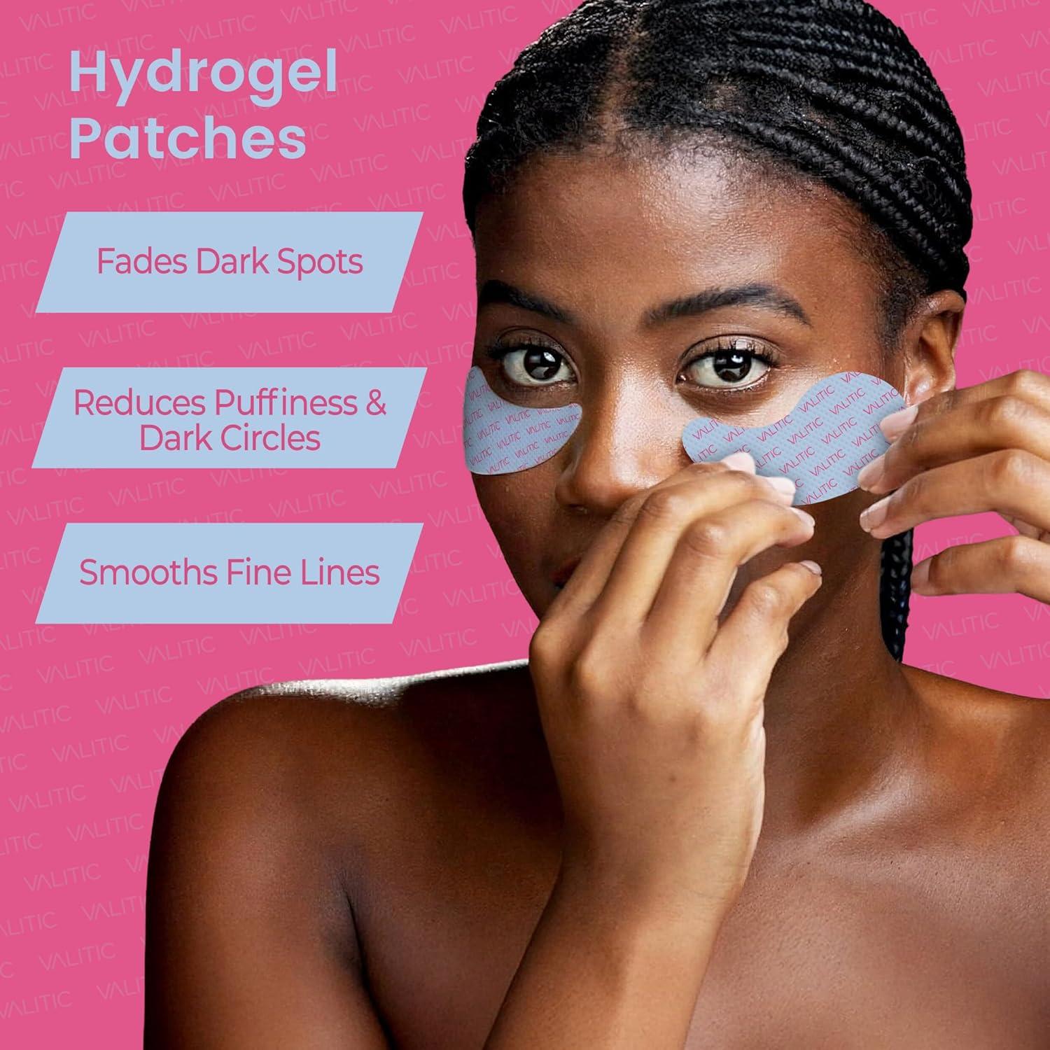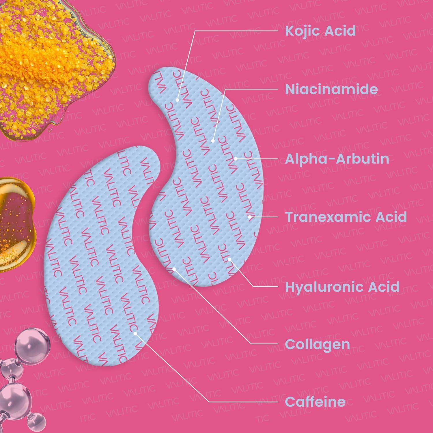 Soothing Hydrogel Patches – VALITIC under eye brightening patches infused with Kojic Acid, Niacinamide, Alpha Arbutin and Tranexamic Acid work together to brighten dark spots and even out skin tone