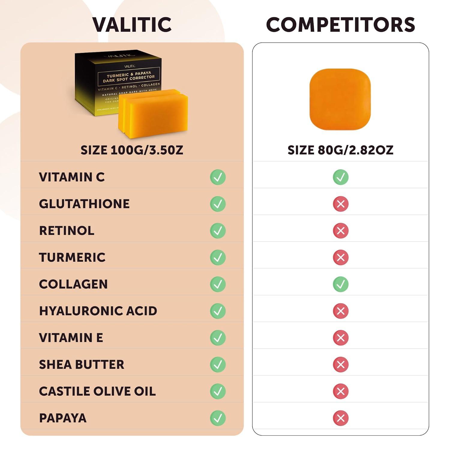 Dark Spot Corrector: Our VALITIC Soap Bars with Turmeric & Papaya features an enhanced formula that targets and effectively reduces the root causes of dark spot, including hyperpigmentation, sun damage, acne scars, and age spot